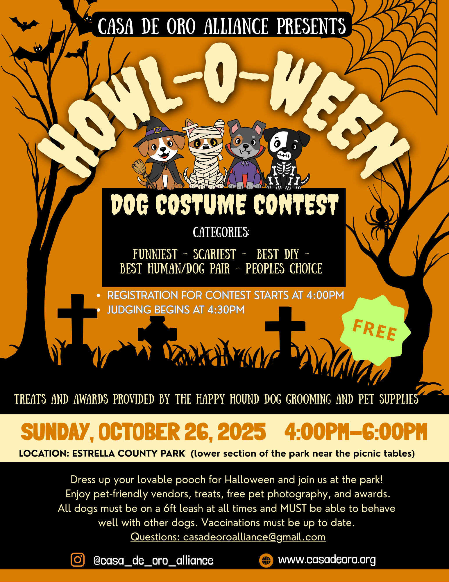 The Casa de Oro Alliance’s event committee invites you to dress up your lovable pooch for Halloween and join us at Estrella Park for some Howl-O-Ween fun!