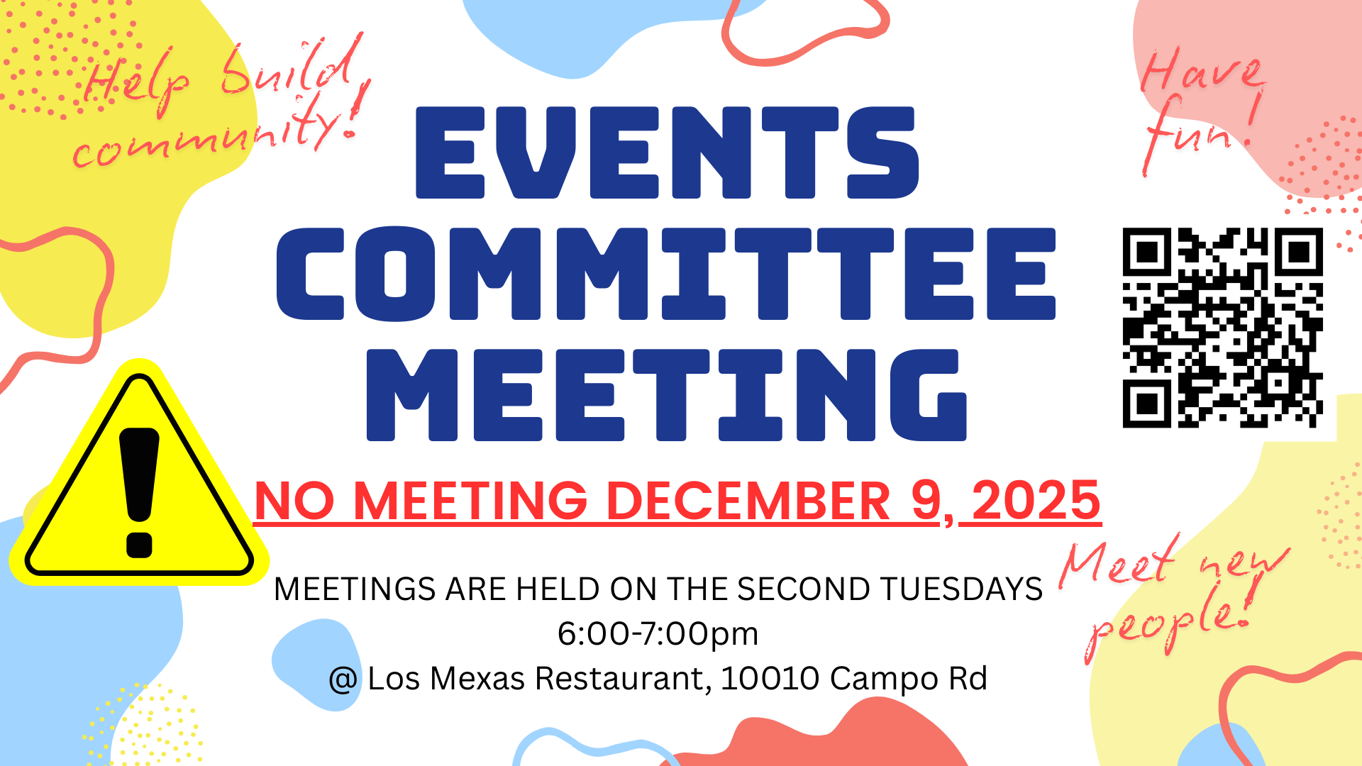 Update: the Events Committee meeting for December is canceled. Please join us in January!